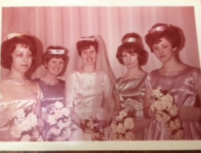 At 2.50 our cars arrived. I stood at the window and watched the bridesmaids pile into their car. The colours of the dresses looked gorgeous. Then it was my turn. I was in a terrible state. Dad held up my train so it wouldn’t get dirty and I held my prayerbook in one hand and held the hem of my dress off the ground with the other. As I reached the gate the wind caught my veil and blew it across my face. It was on my lipstick and I didn’t want a red mark on my veil but I didn’t know what to do about it. I stopped and shook my head until it until the wind moved it again. Afterwards, when I thought about it I could have let my dress hem go as it didn’t touch the floor anyway. But nothing going on in my head made much sense at that time!